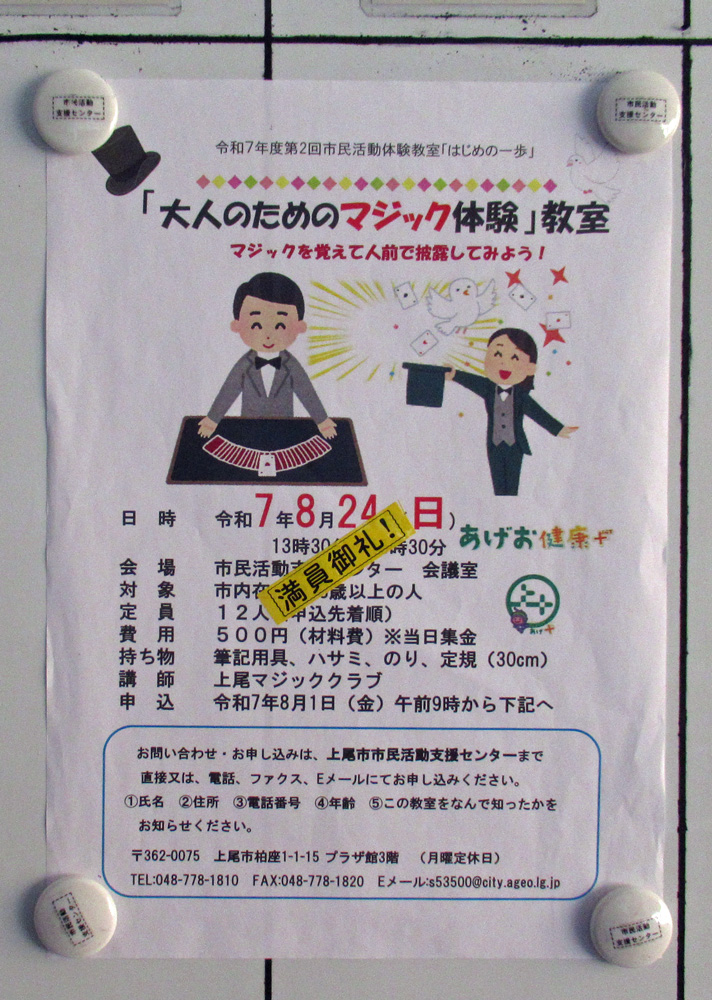 2025(令和7)年8月24日(日) はじめの一歩「おとなのためのマジック体験教室」が開催され、上尾マジッククラブは講師を務めました。上尾市民12名が参加して、新聞紙、ロープ、トランプを使ったマジックを2時間にわたり学習しました。最後に数名の参加者が全員の前で、覚えたばかりのマジックを披露しました。