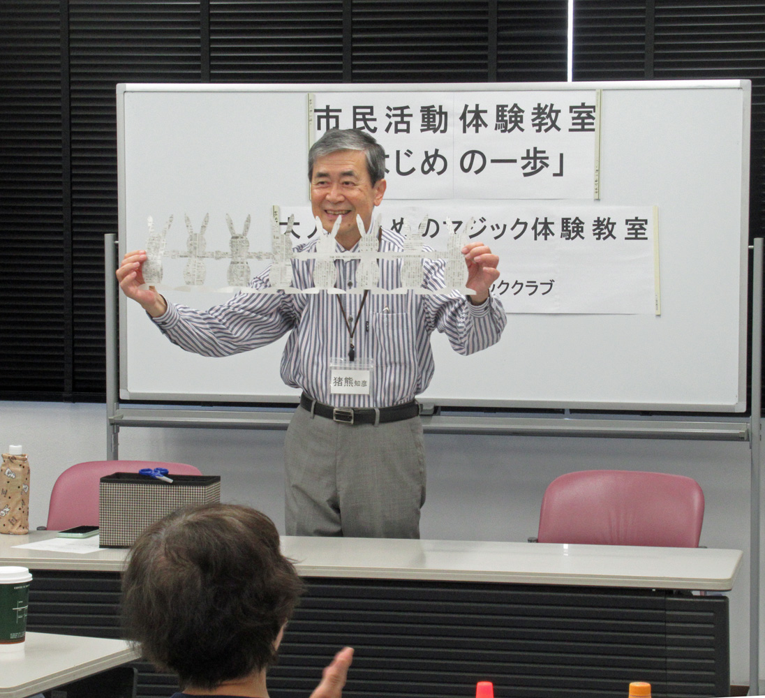 2024(令和6)年8月25日(日) 上尾市市民活動支援センター主催による講座が開催され、上尾マジッククラブが講師を務めました。40代から80代の市民10名が受講し、4つのマジックに挑戦しました。