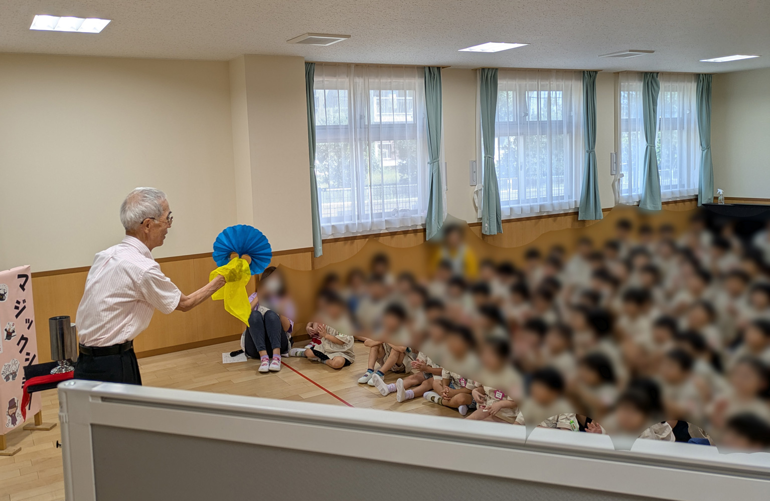2025(令和7)年9月2日(火) 西上尾しらぎく幼稚園でサマーフェスティバルが開催され、上尾マジッククラブが7年ぶりにマジックを披露しました。おそらく初めて見るマジックに、会場は百数十人の子どもたちの大歓声に包まれました。