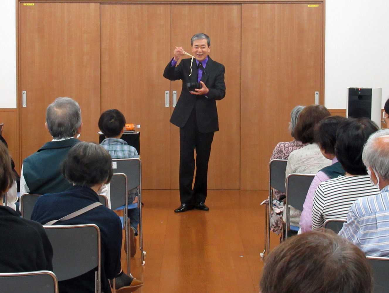 2022(令和4)年10月26日(水) 上尾市社会福祉協議会上尾東支部の、ぬくもり交流会が上尾市文化センター小ホールで開催され、支部管内の75歳以上の一人暮らしの方々約80名が参加しました。プログラムは、腹話術、マジック、落語で構成され、上尾マジッククラブからは2名が出演しました。