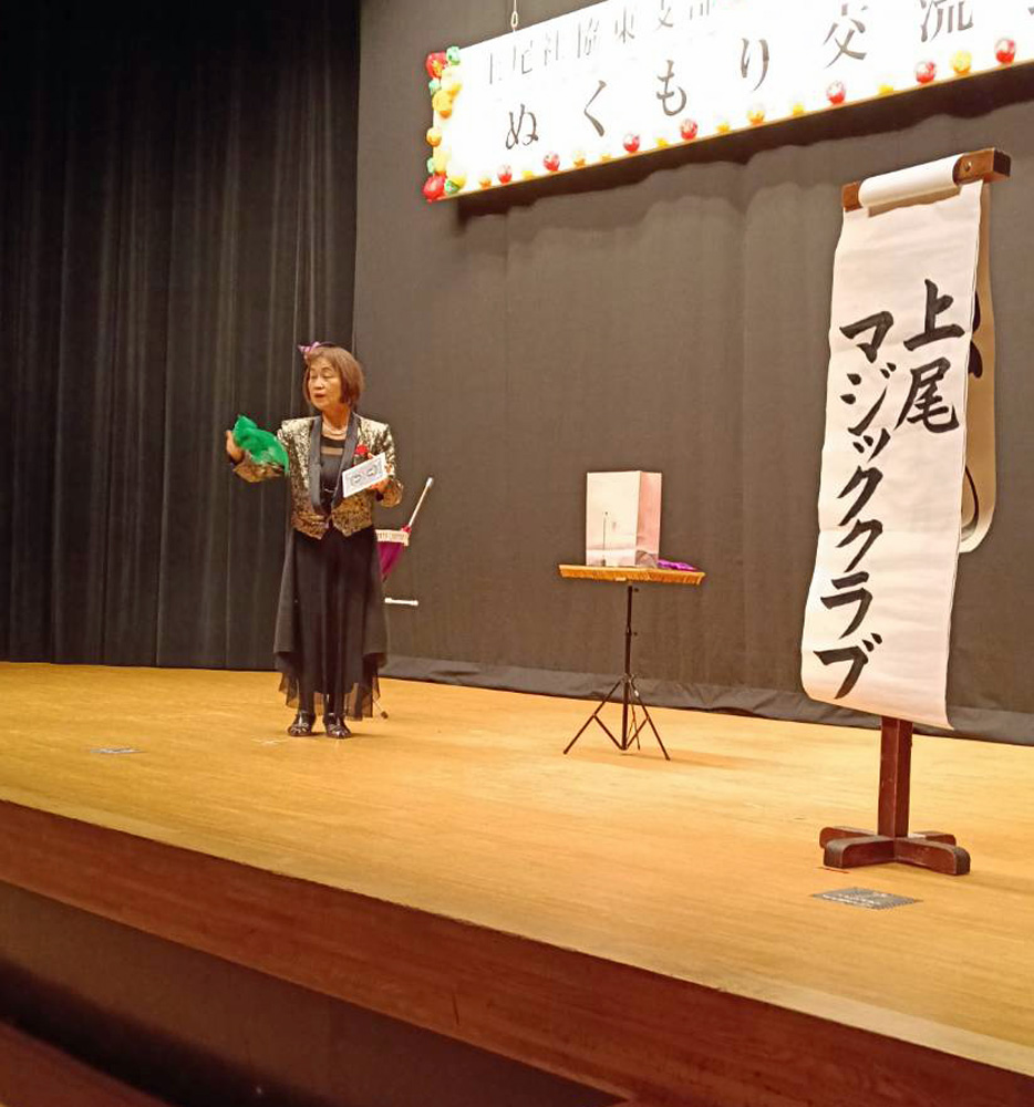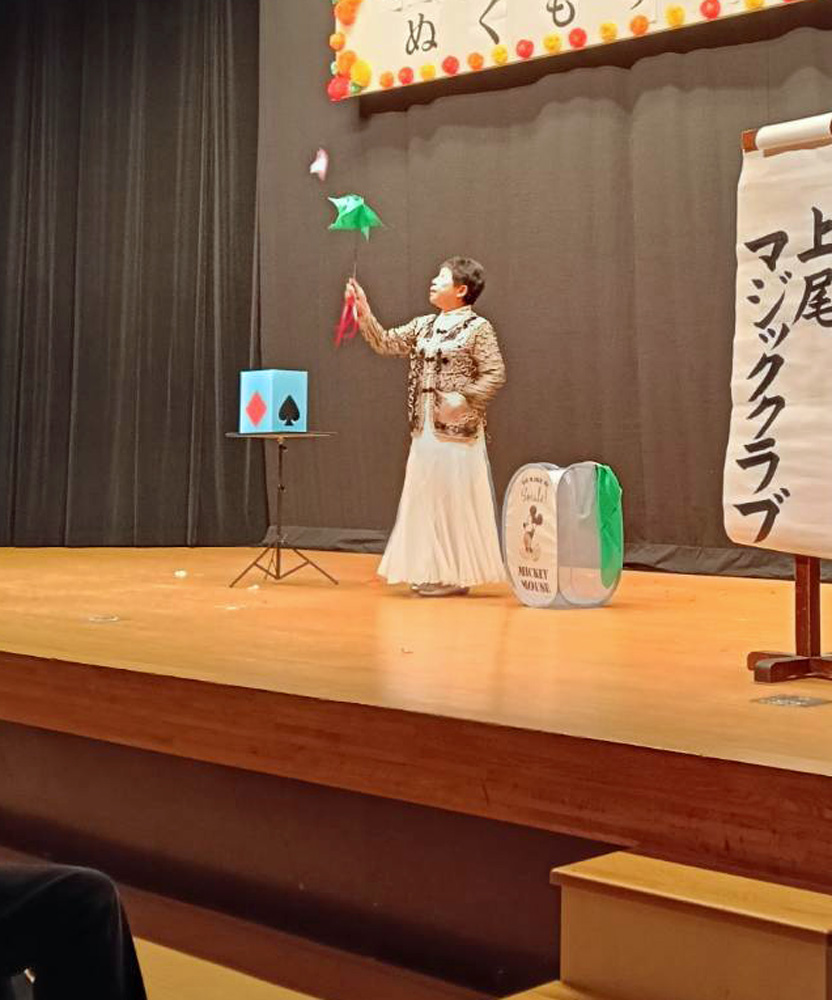 2024(令和6)年12月1日(日) 上宿自治会で「みんなの集い」が開催されました。午前中は防災講話があり、午後は上尾マジッククラブによるマジックショー、そのほかオカリナやフラダンスが披露されました。 入会間もない新人会員も1名参加してマジックを演じました。マジックに挑戦!