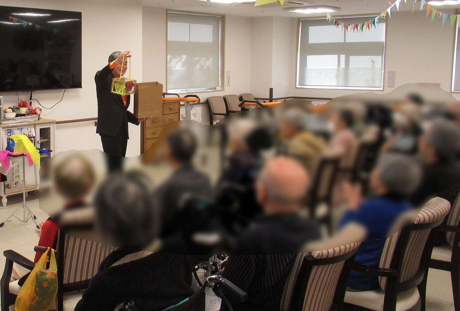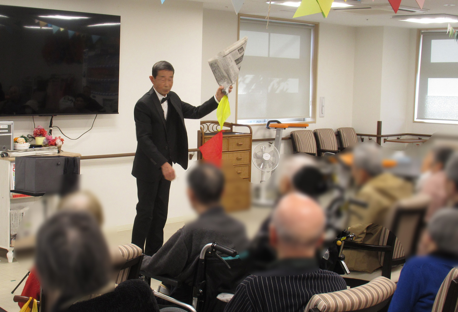 2024(令和6)年5月22日(水) 上尾マジッククラブは4名の会員でデイサービス施設なごやかレジデンス上尾二ツ宮でマジックショーを披露しました。利用者さん約30名で会場がいっぱい。秋ごろにまた来てほしいとのお話をいただきました。